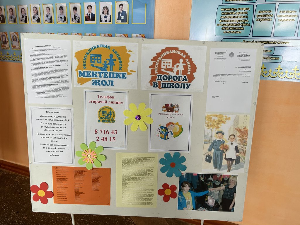 «Мектепке жол» республикалық акциясы мектеп оқушыларының толық қатысуын қамтамасыз ету мақсатында өткізіледі. Акцияның басталуы 2023 жылдың 1 тамызынан, аяқталуы - 2023 жылдың 30 қыркүйегінде.Акцияның ұраны: Жақсылықты жаса.