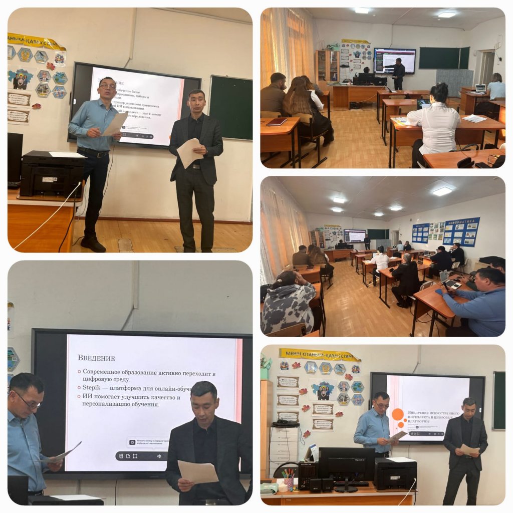 Бүгін, 2025 жылғы 30 қазанда, аудандық әдістемелік бірлестік (ӘБ) отырысында №4 жалпы білім беретін мектептің мұғалімі Сейденов Б.С. «Жасанды интеллектіні цифрлық платформаларға енгізу» тақырыбында баяндама жасады. Баяндамасында ол Stepik платформасында жасанды интеллект технологияларының қолданылу ерекшеліктеріне тоқталды.